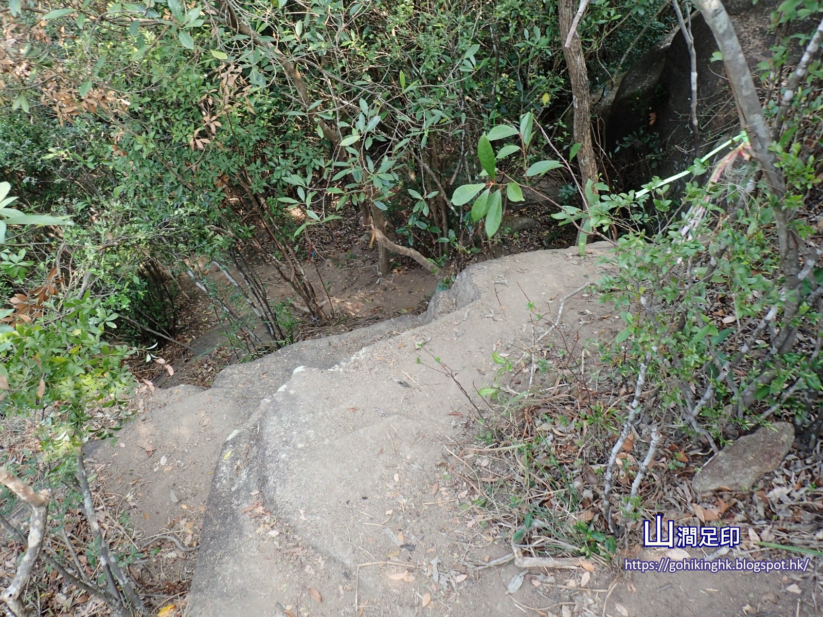 要到魚簍石,必須先由290米高下降至250米,高低相差40米,遠距80米,加上泥面山徑,兩旁無扶手,步步難行: