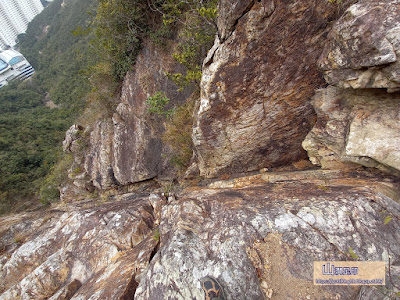 峽槽盡頭垂直倒石位,左邊倒石、右邊斜壁、腳下斜面、頭頂高落差,著力點只有左手及雙腳,還欠右邊著力點,沒有右手手拉位,只有右腳踏位,但踏位是7、80度斜面,沒有學過攀石不可能攀上。如不直接上攀,可於坑槽左邊凹凸岩牆攀至槽頂︰