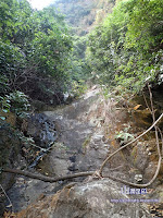 圖中位置是一個極大落差 (高過「夠擠」)及濕滑的石階與斜坡,看看女友狼狽的樣子就想像到要登上是十分困難的,這一刻我正在盤算,如果「夠擠」仍然跟上,我們只好送它回家,如果不能,也要看著牠安全返回澗底 (看看「夠擠」,牠好像有點驚慌,在進退兩難之間,請放心我會協助你脫離險境的)